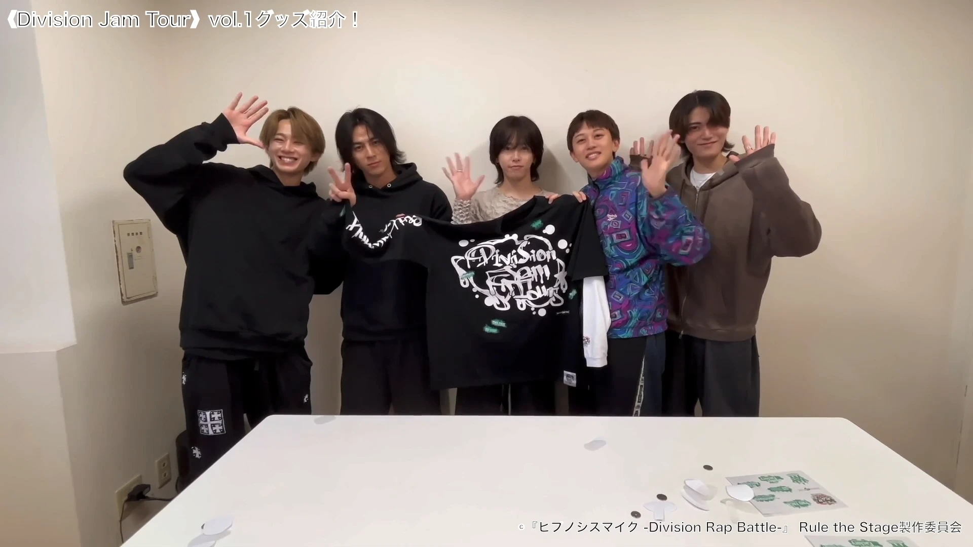 《Division Jam Tour》vol.1 グッズ紹介!〜ファブリックシール、ロングTシャツ〜 按雲 真日瑠役:SHIN、五十里 蘭丸役:手島 聖貴、茶臼山 良経役:奥村 等士、霧村 徳磨役:Jun、飛砂風 紫音役:蒼井 嵐樹